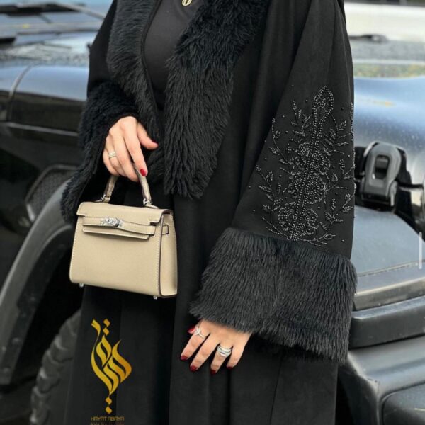 عباه بتصميم شتوي قماش شامواه خليجي فخم حركه فرو قبه واكمام مع اضافة شك الخرز