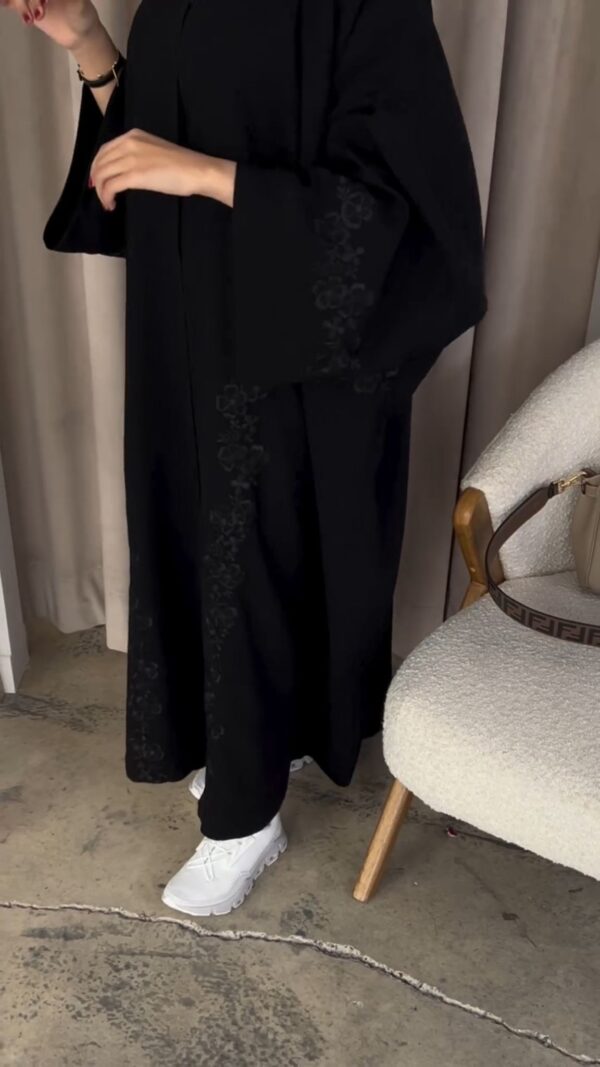 عباه بقماش لميا حركة تطريز اسود اكمام وع طولها