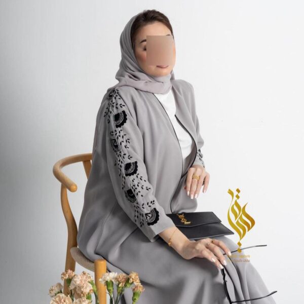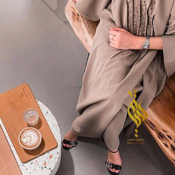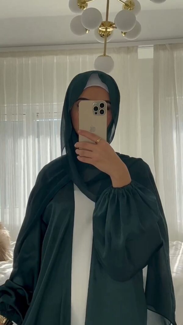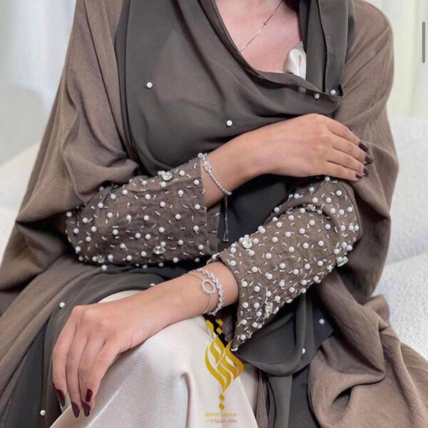 عباه قماش تفته خليجي لون زيتي حركة كم زمه مع فستان ابيض
