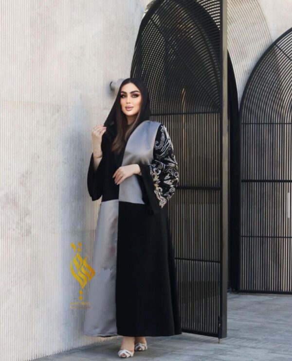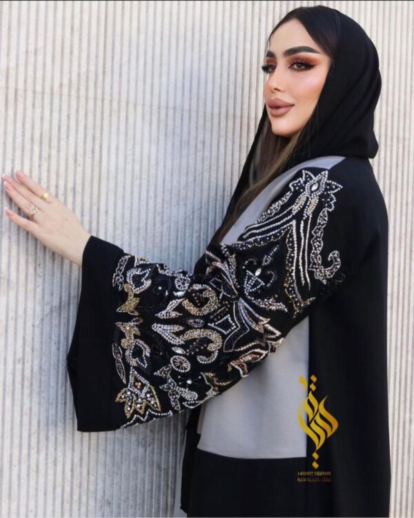 عباه مكونه من تدخيل نوعين من القماش مع حركة شك خرز على الكم كامل